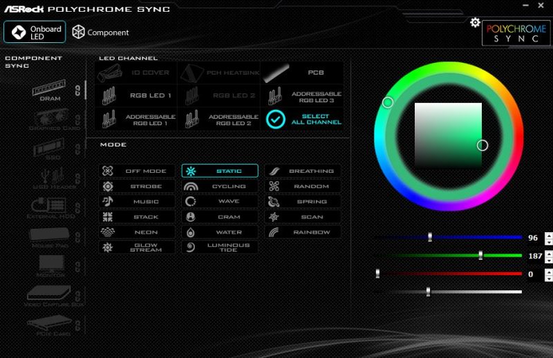 今回のPC環境では、オンボードLEDのほか、CPUクーラー、ビデオカードホルダーが「Onboard LED」として認識され、まとめて設定することができました。メモリは「Component」として別タブで簡易的に設定できましたが、このソフトを起動しないと効果が反映されない残念な状態です。