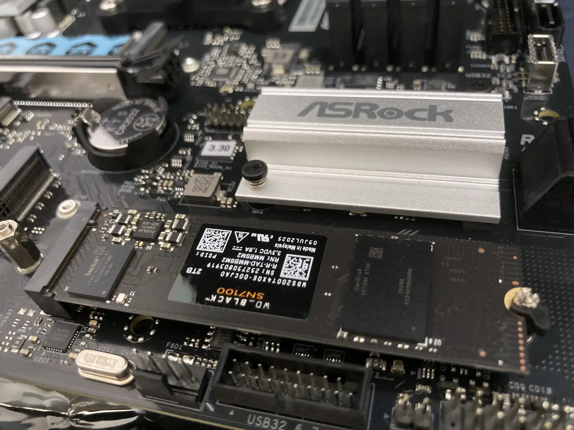 しかし、PCI Express Gen5対応スロットからヒートシンクを取り外したところ、ボトムヒートシンクの保護シールがよく見えてしまい、見栄え的に残念な状況に。見栄え優先として、PCI Express Gen5対応スロットにWD Black SN7100 NVMe SSD WDS200T4X0Eをセットしなおすことにしました。